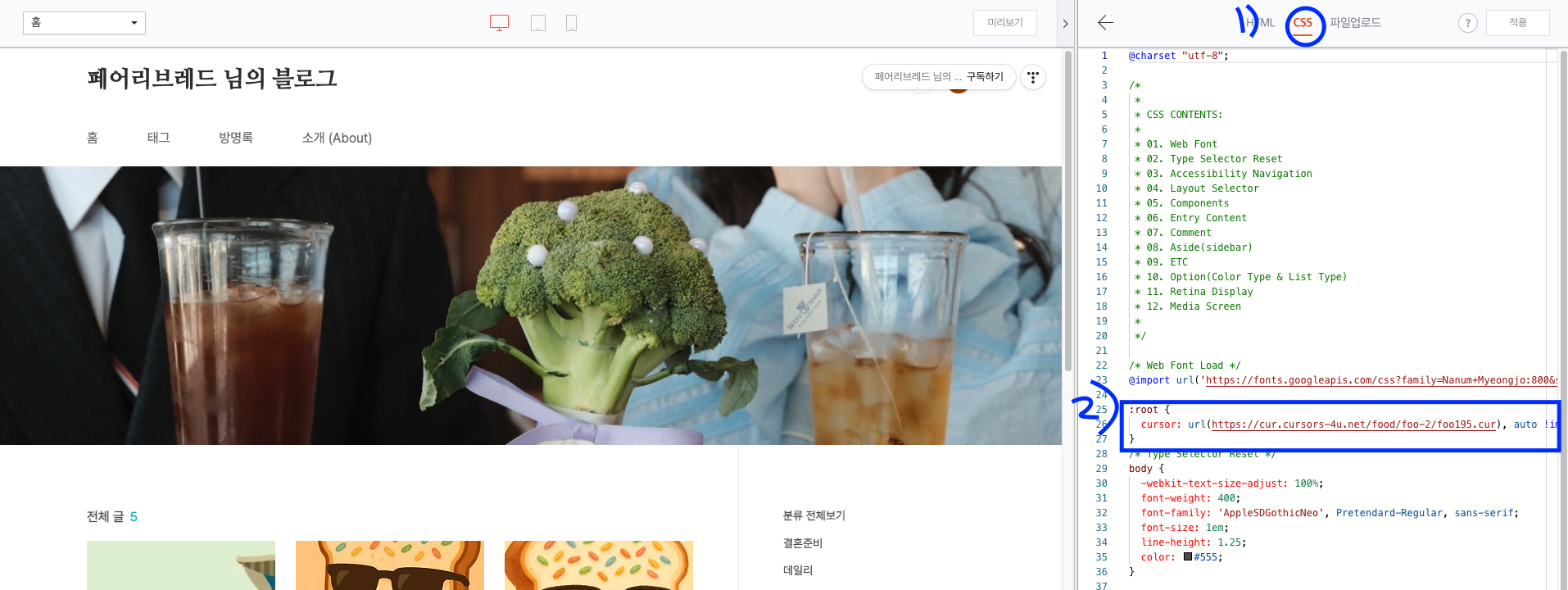 3) css 클릭 -> 위에 원하시는 커서 복사 + 붙히기 하고 적용!